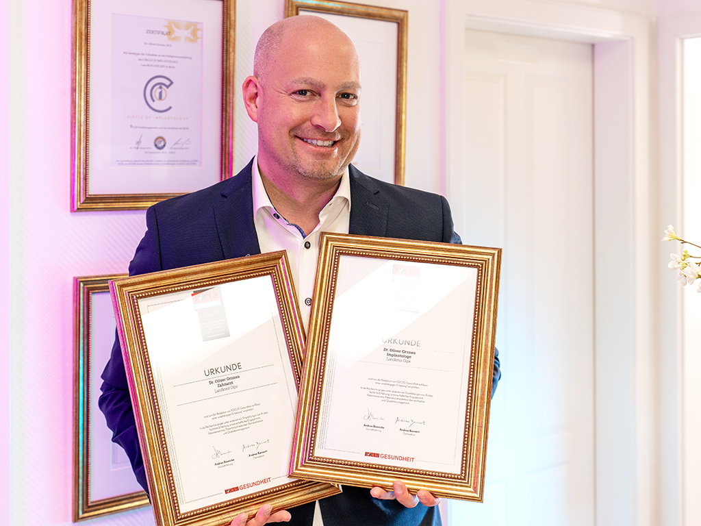 Auszeichnung FOCUS: Regionale Empfehlung Implantologie und Parodontologe, sowie erneut regionale Empfehlung Zahnarzt.